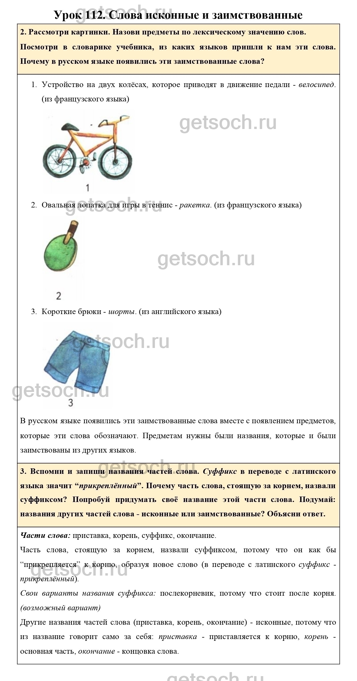 3. Вспомни и запиши названия частей слова. Суффикс в переводе с латинского языка значит “прикреплённый”. Почему часть слова, стоящую за корнем, назвали суффиксом? Попробуй придумать своё название этой части слова. Подумай: названия других частей слова – исконные или заимствованные? Объясни ответ.