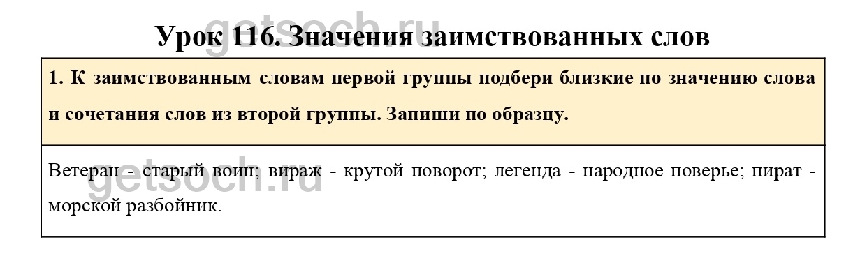 1. К заимствованным словам первой группы подбери близкие по значению слова и сочетания слов из второй группы. Запиши по образцу.