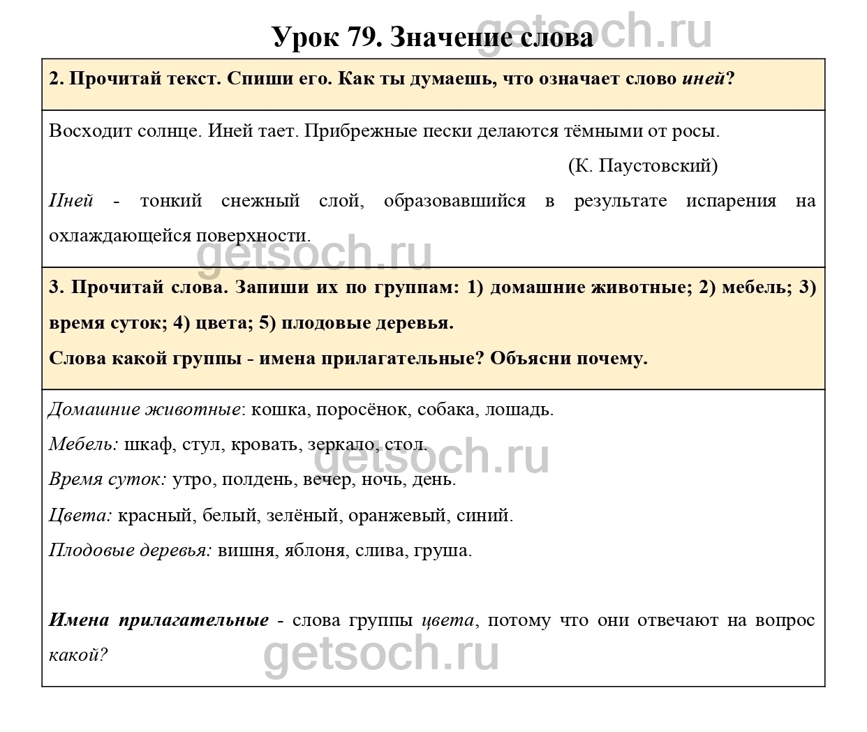 “3. Прочитай слова. Запиши их по группам: 1) домашние животные; 2) мебель; 3) время суток; 4) цвета; 5) плодовые деревья.