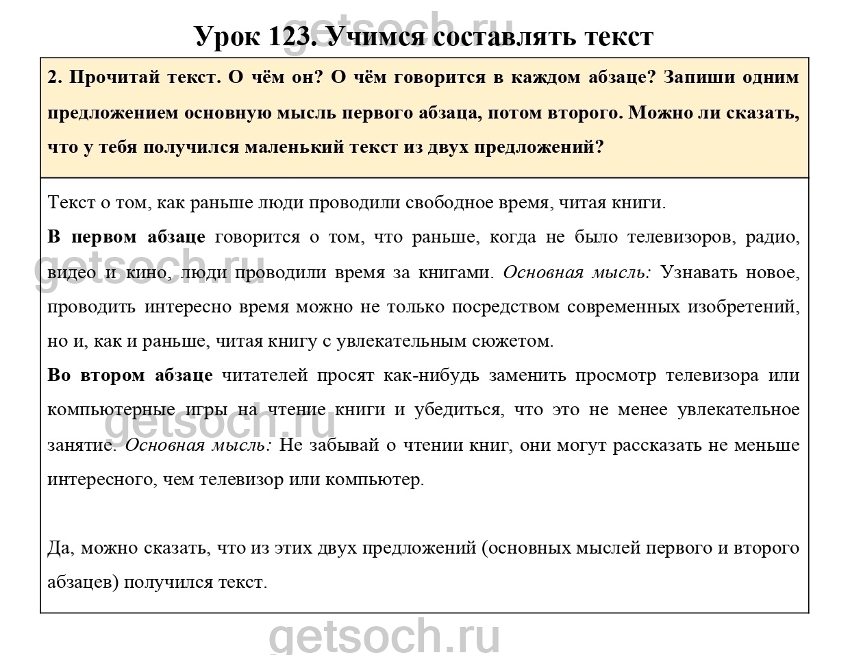 2. Прочитай текст. О чём он? О чём говорится в каждом абзаце? Запиши одним предложением основную мысль первого абзаца, потом второго. Можно ли сказать, что у тебя получился маленький текст из двух предложений?