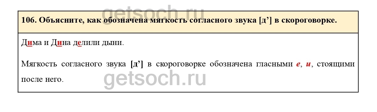 106. Объясните, как обозначена мягкость согласного звука [д’] в скороговорке.