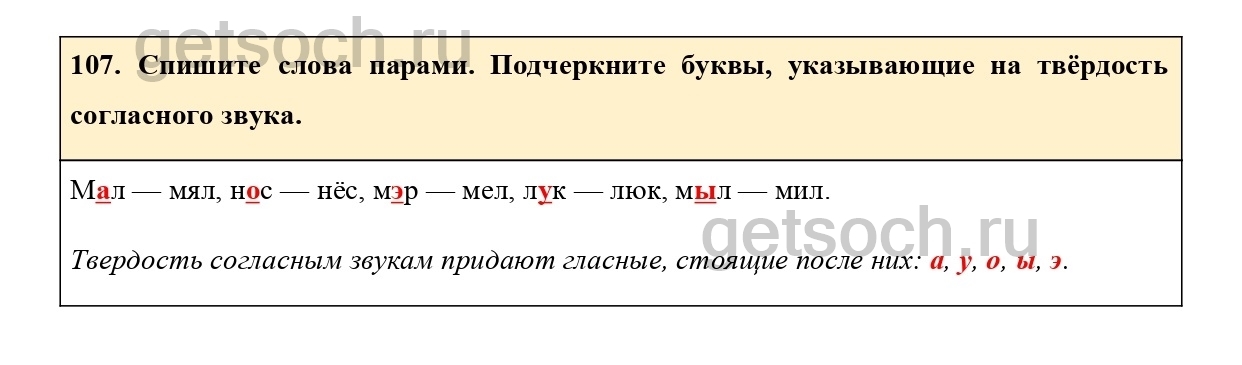 107. Спишите слова парами. Подчеркните буквы, указывающие на твёрдость