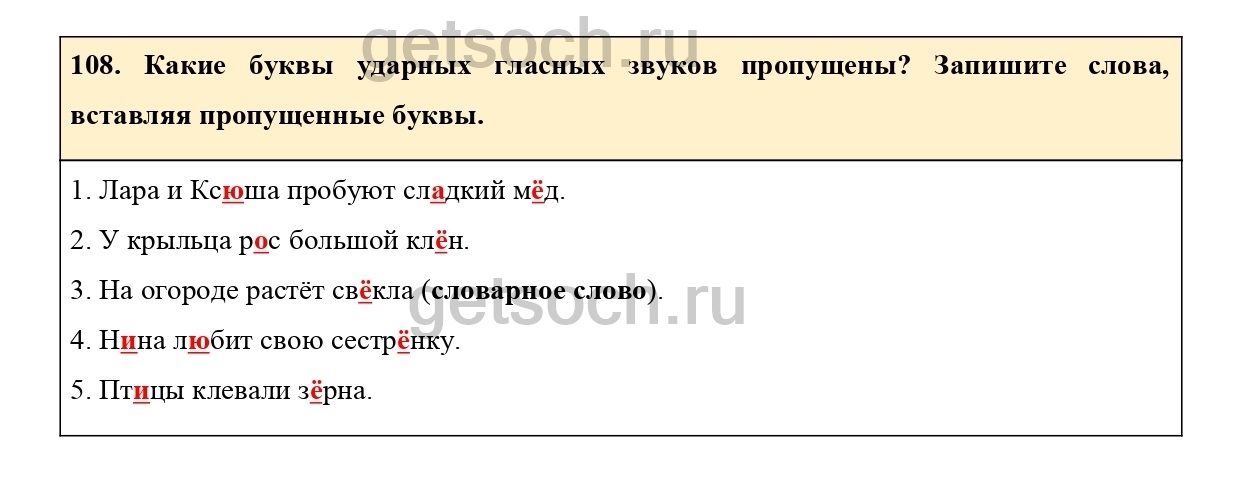 108. Какие буквы ударных гласных звуков пропущены? Запишите слова,