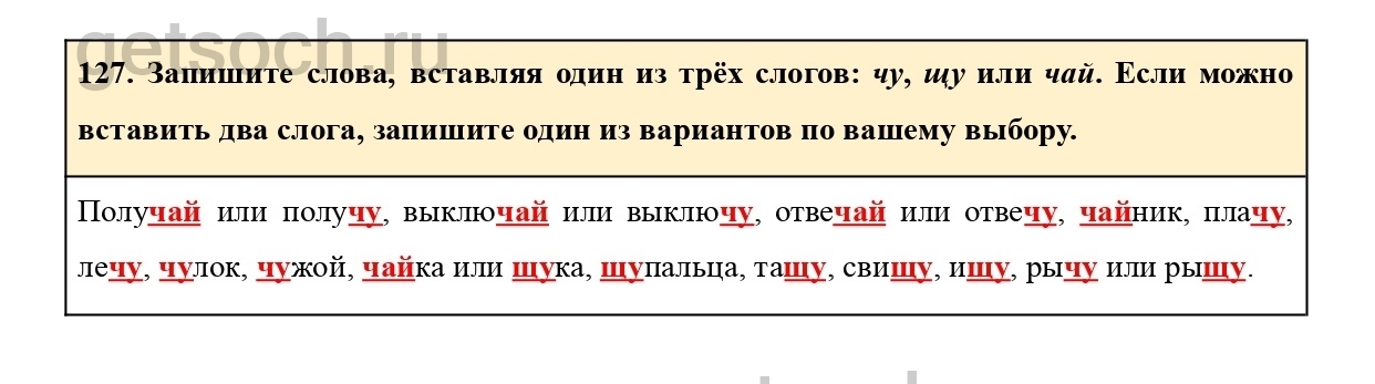 127. Запишите слова, вставляя один из трёх слогов: чу, щу или чай. Если можно