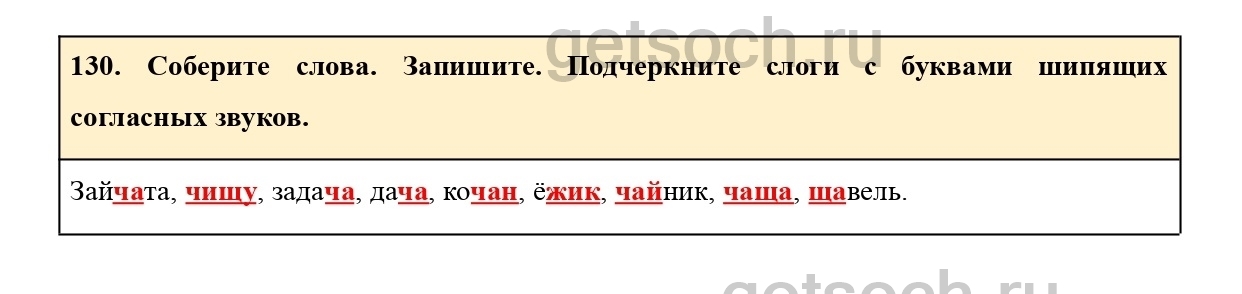 130. Соберите слова. Запишите. Подчеркните слоги с буквами шипящих