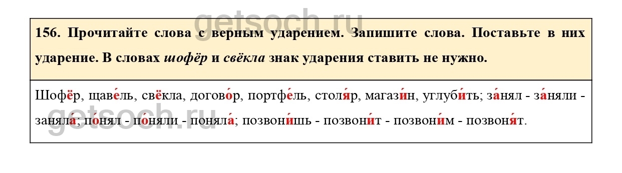 156. Прочитайте слова с верным ударением. Запишите слова. Поставьте в них