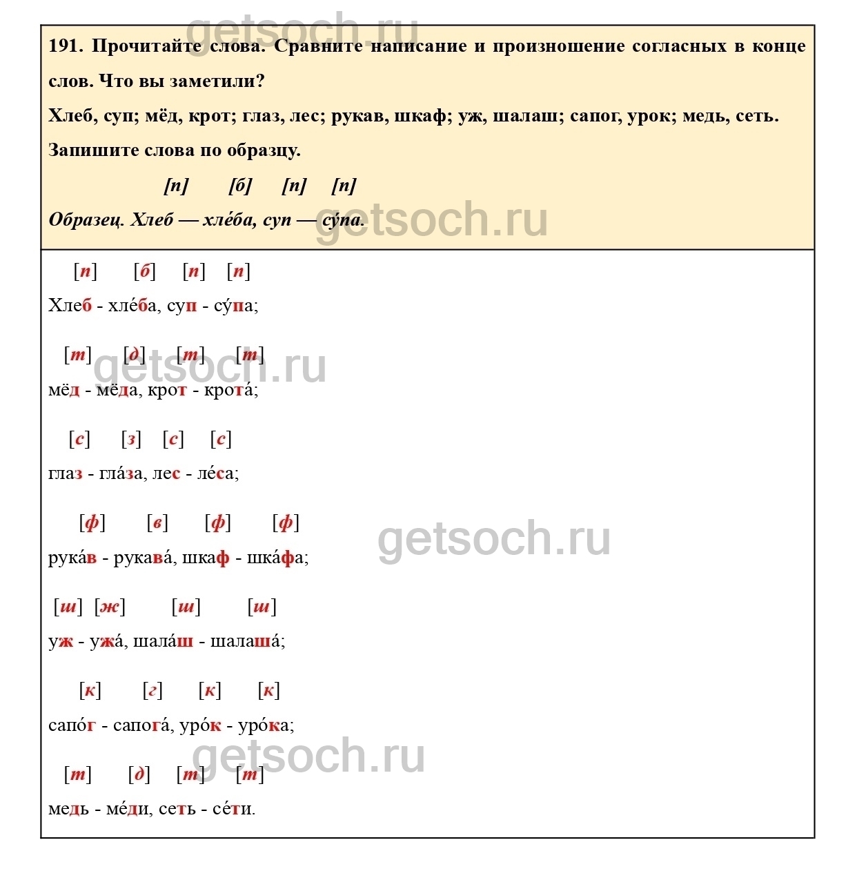 191. Прочитайте слова. Сравните написание и произношение согласных в конце