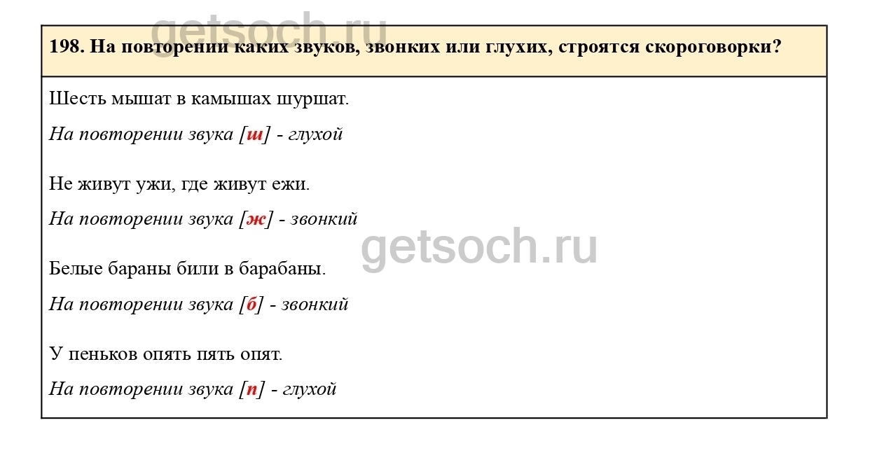 198. На повторении каких звуков, звонких или глухих, строятся скороговорки?