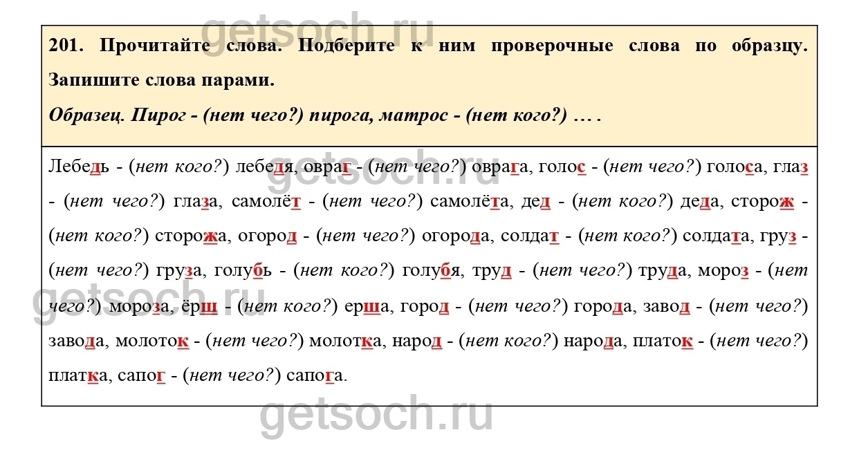 201. Прочитайте слова. Подберите к ним проверочные слова по образцу. Запишите