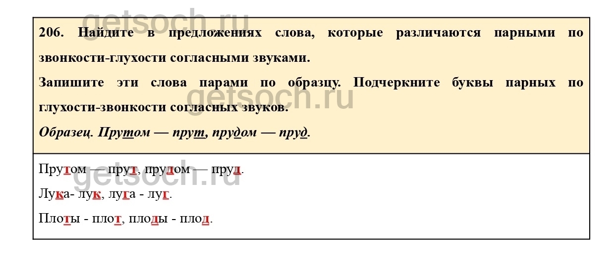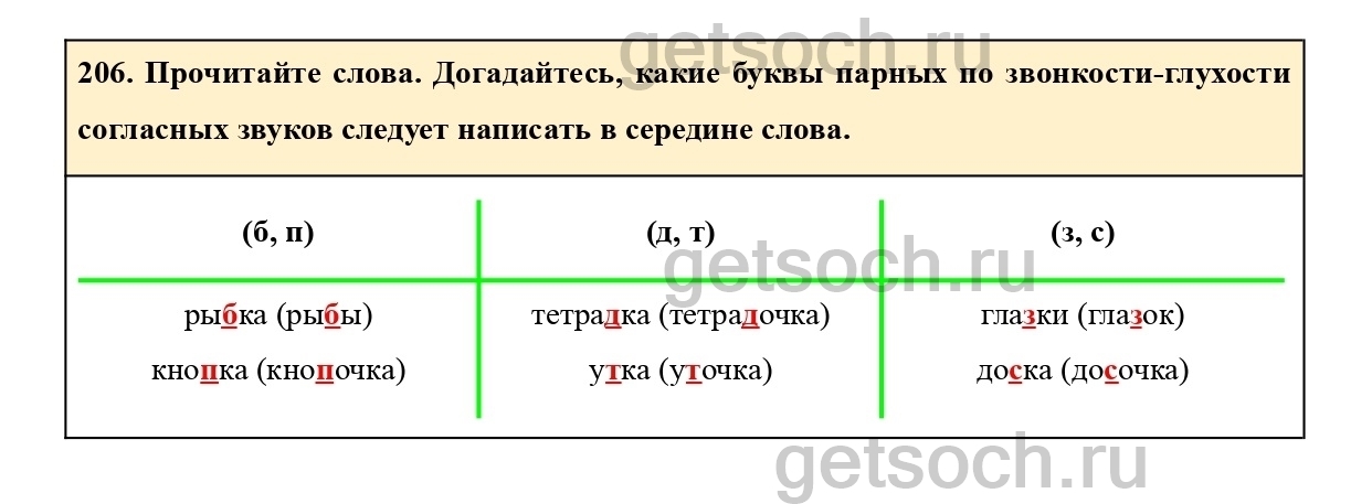 206. Прочитайте слова. Догадайтесь, какие буквы парных по звонкости-глухости