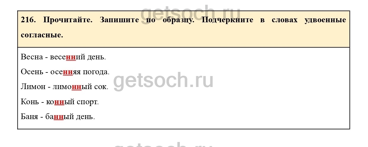 216. Прочитайте. Запишите по образцу. Подчеркните в словах удвоенные
