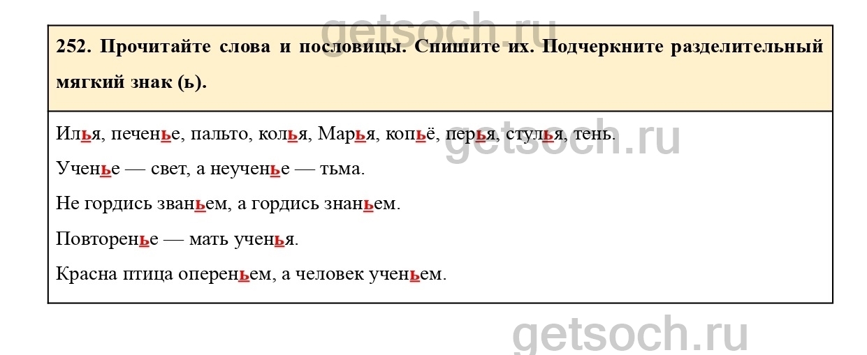Прочитайте слова и пословицы. Спишите их. Подчеркните разделительный мягкий знак (ь).