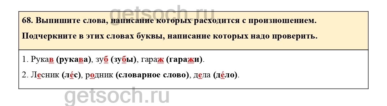 68. Выпишите слова, написание которых расходится с произношением.