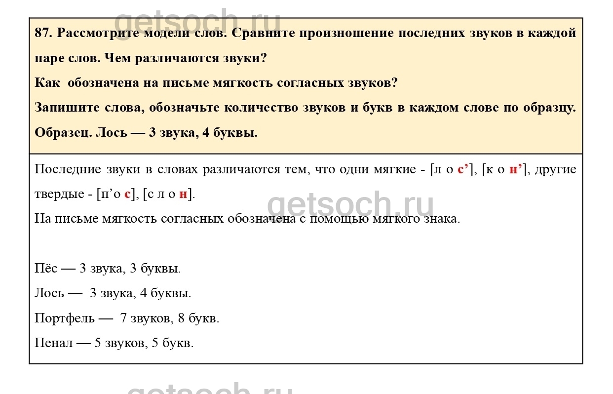87. Рассмотрите модели слов. Сравните произношение последних звуков в каждой