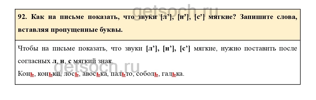92. Как на письме показать, что звуки [л’], [н’], [с’] мягкие? Запишите слова,