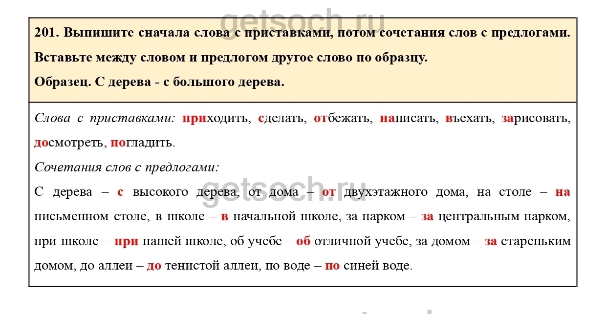 201. Выпишите сначала слова с приставками, потом сочетания слов с предлогами.
