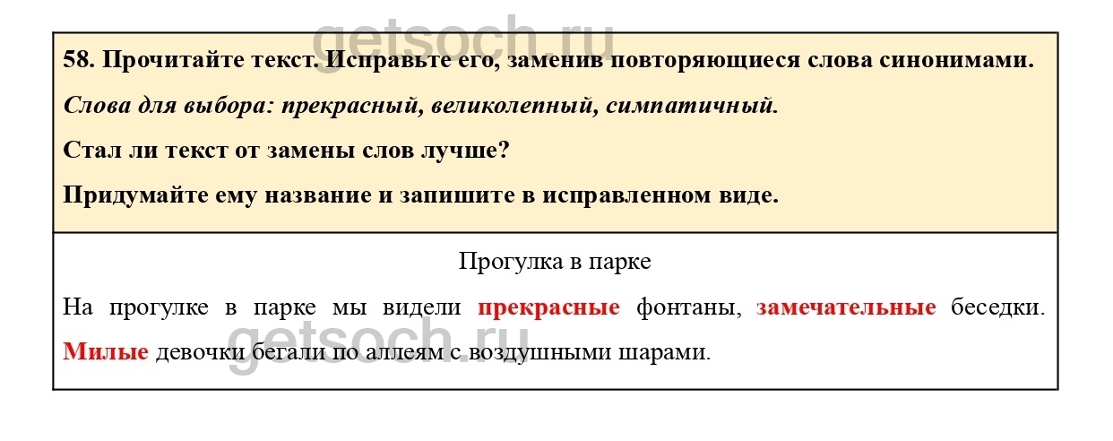 58. Прочитайте текст. Исправьте его, заменив повторяющиеся слова синонимами.