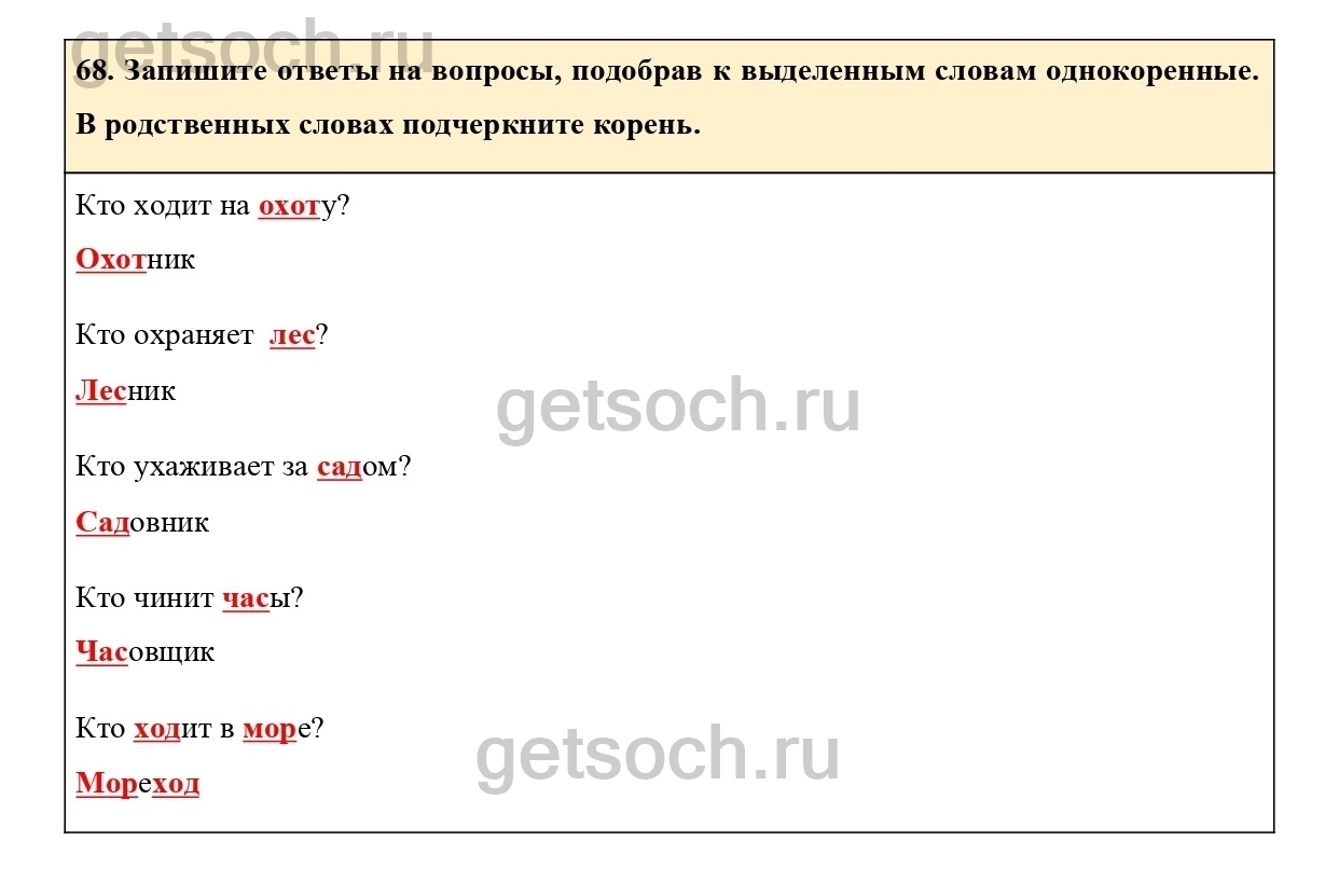 68. Запишите ответы на вопросы, подобрав к выделенным словам однокоренные.
