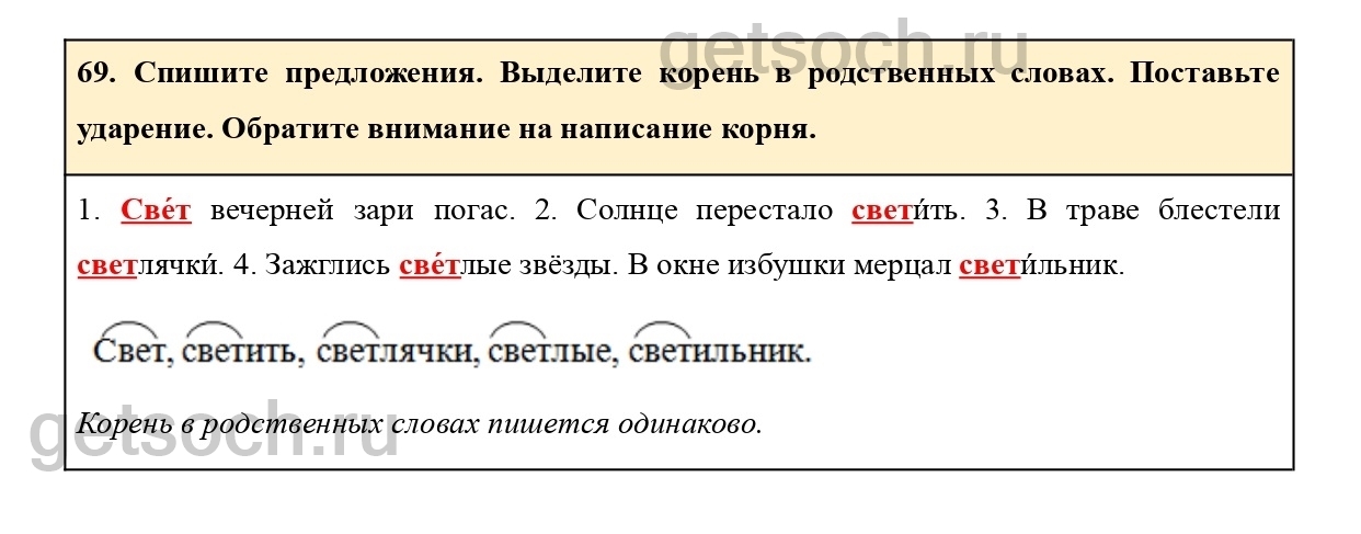 69. Спишите предложения. Выделите корень в родственных словах. Поставьте