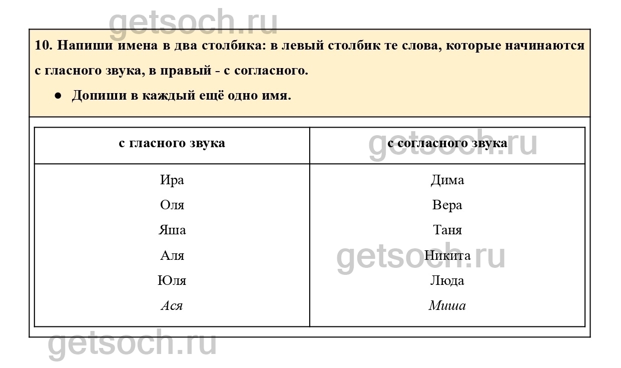 10. Напиши имена в два столбика: в левый столбик те слова, которые начинаются