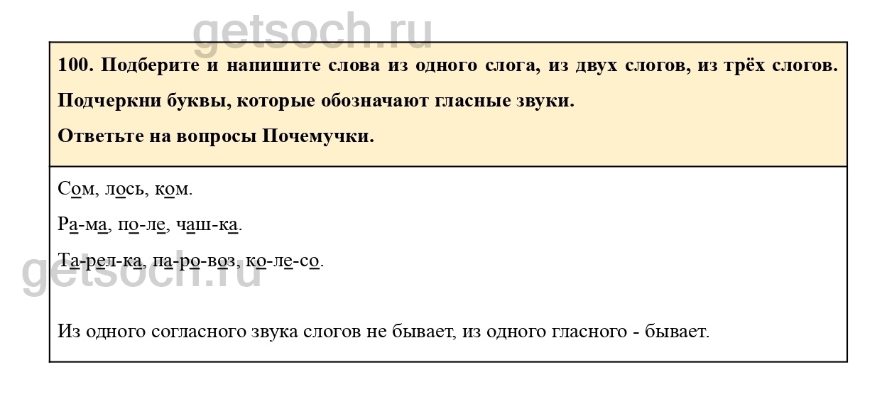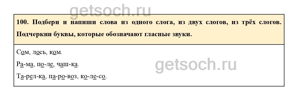 100. Подбери и напиши слова из одного слога, из двух слогов, из трёх слогов.