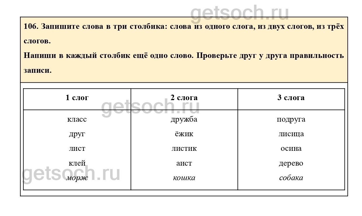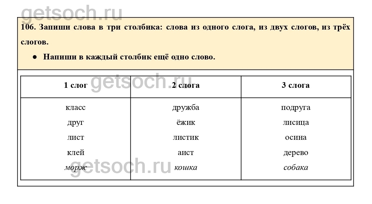 106. Запиши слова в три столбика: слова из одного слога, из двух слогов, из трёх