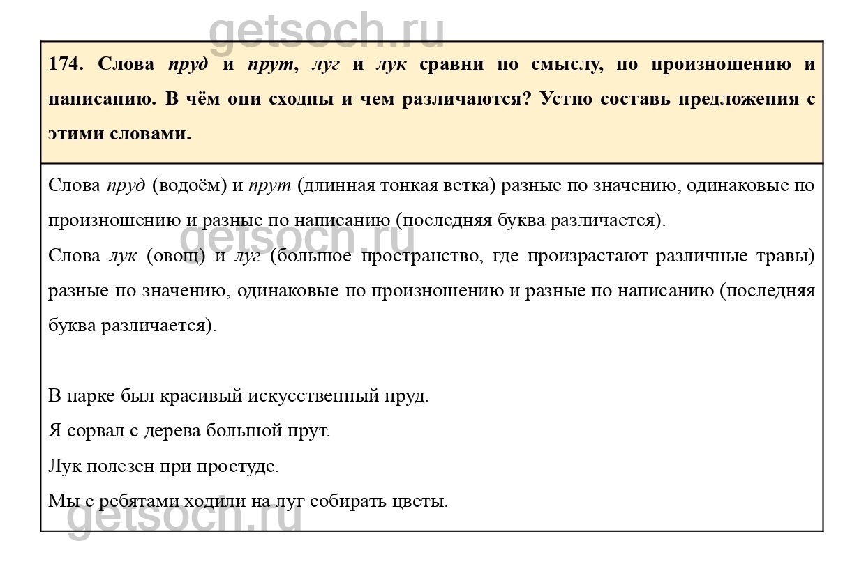 174. Слова пруд и прут, луг и лук сравни по смыслу, по произношению и