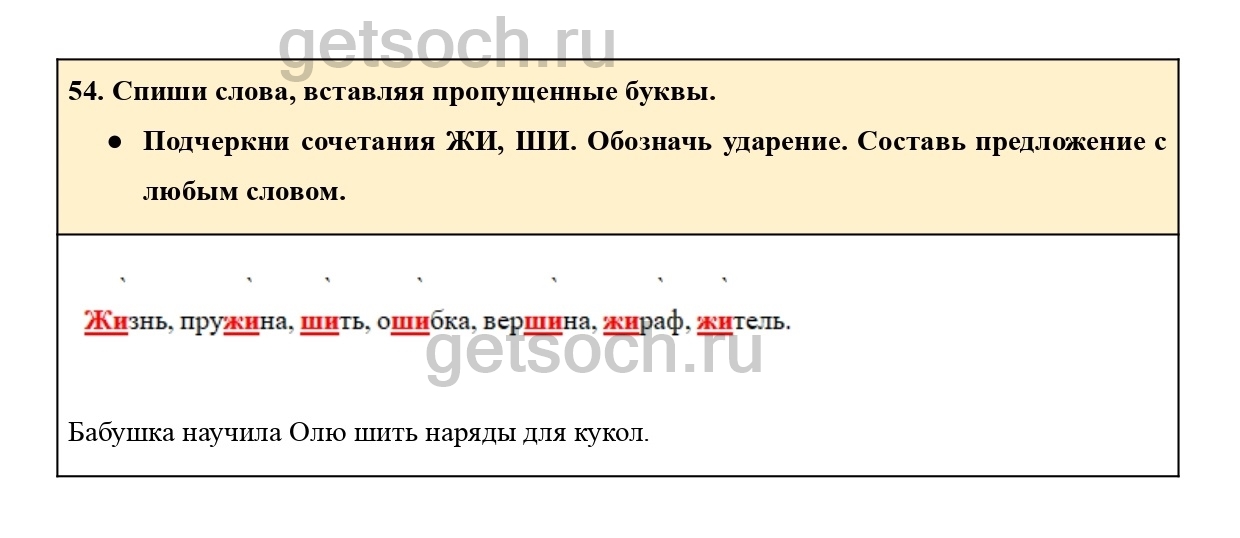 ● Подчеркни сочетания ЖИ, ШИ. Обозначь ударение. Составь предложение с