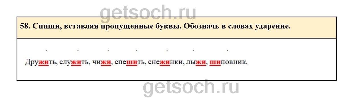 58. Спиши, вставляя пропущенные буквы. Обозначь в словах ударение.