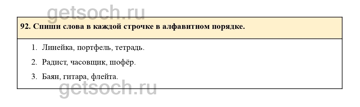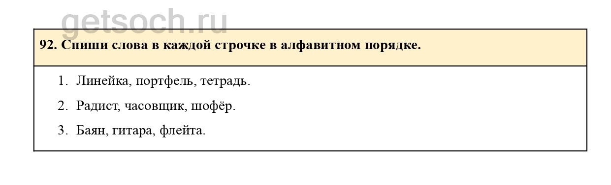 92. Спиши слова в каждой строчке в алфавитном порядке.