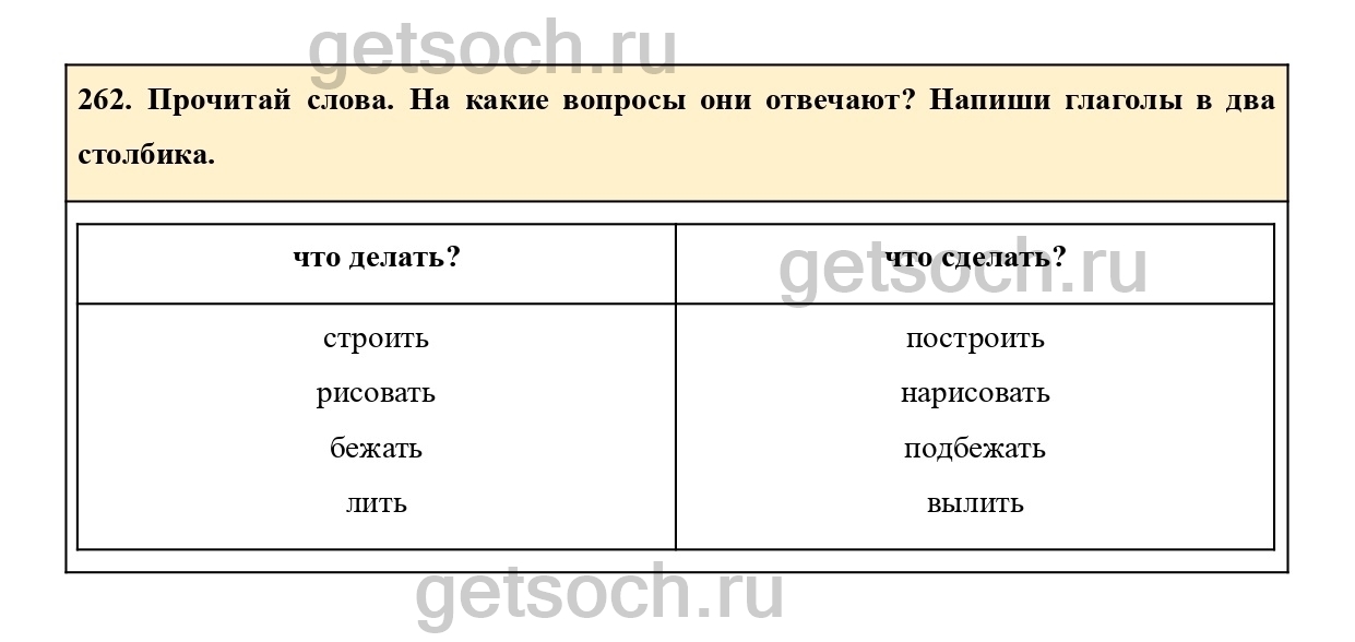 262. Прочитай слова. На какие вопросы они отвечают? Напиши глаголы в два