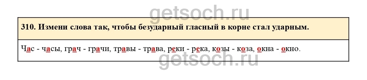 310. Измени слова так, чтобы безударный гласный в корне стал ударным.