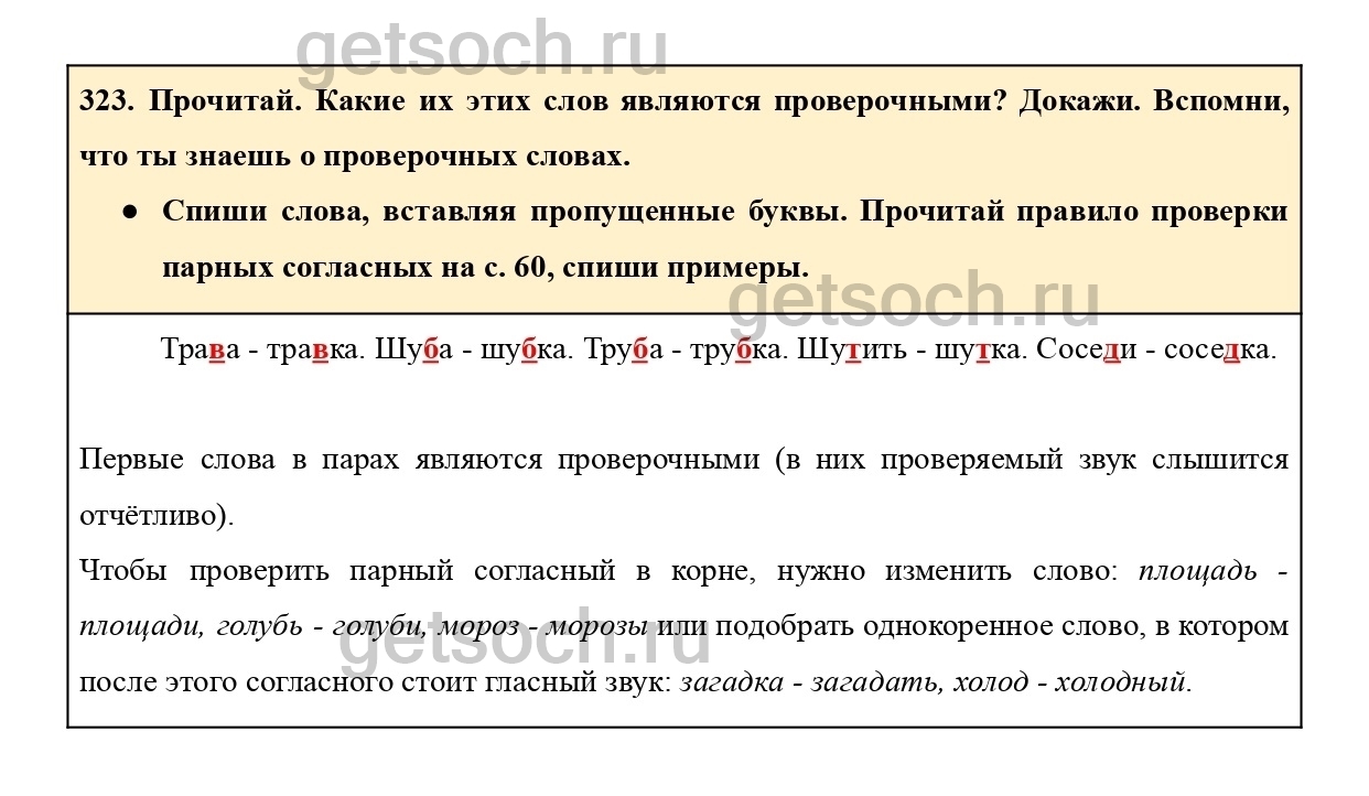 323. Прочитай. Какие их этих слов являются проверочными? Докажи. Вспомни,