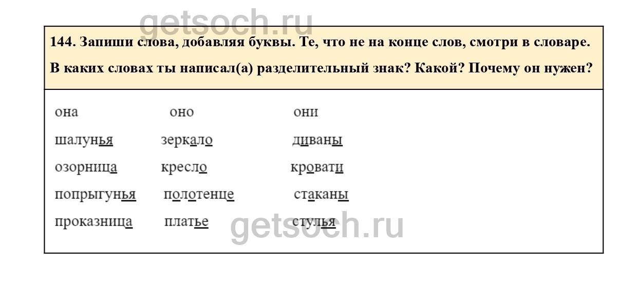 144. Запиши слова, добавляя буквы. Те, что не на конце слов, смотри в словаре.