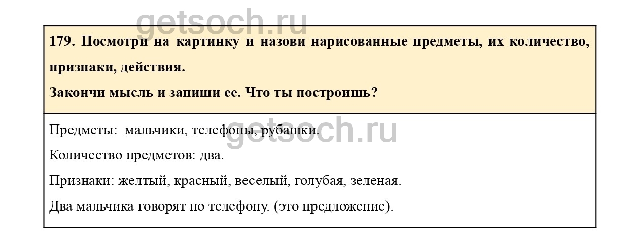 179. Посмотри на картинку и назови нарисованные предметы, их количество, признаки, действия.
