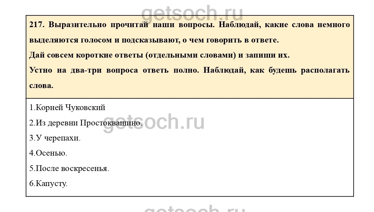217. Выразительно прочитай наши вопросы. Наблюдай, какие слова немного выделяются голосом и подсказывают, о чем говорить в ответе.