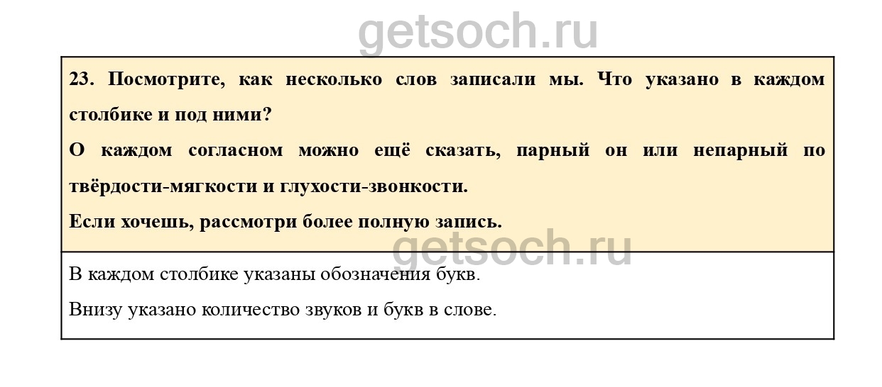 23. Посмотрите, как несколько слов записали мы. Что указано в каждом столбике и под ними?