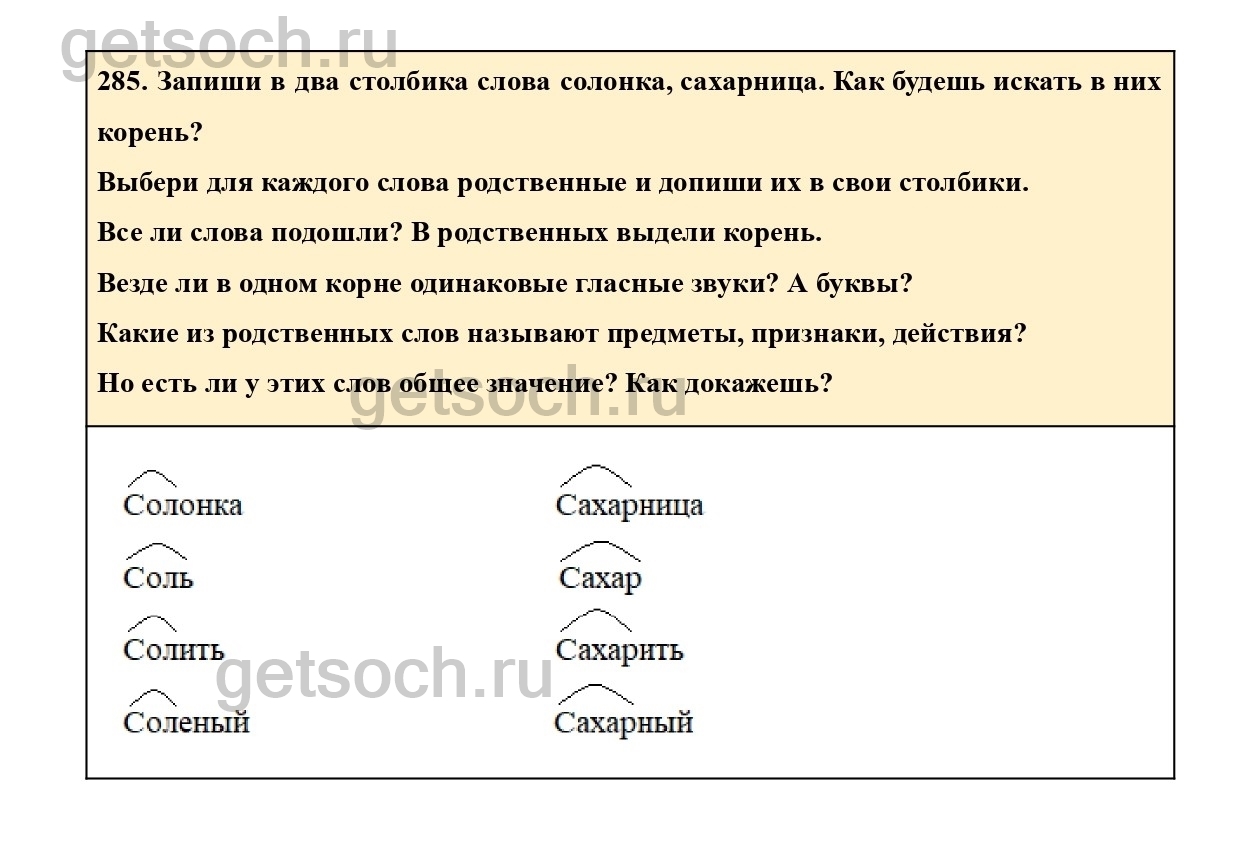 285. Запиши в два столбика слова солонка, сахарница. Как будешь искать в них корень?
