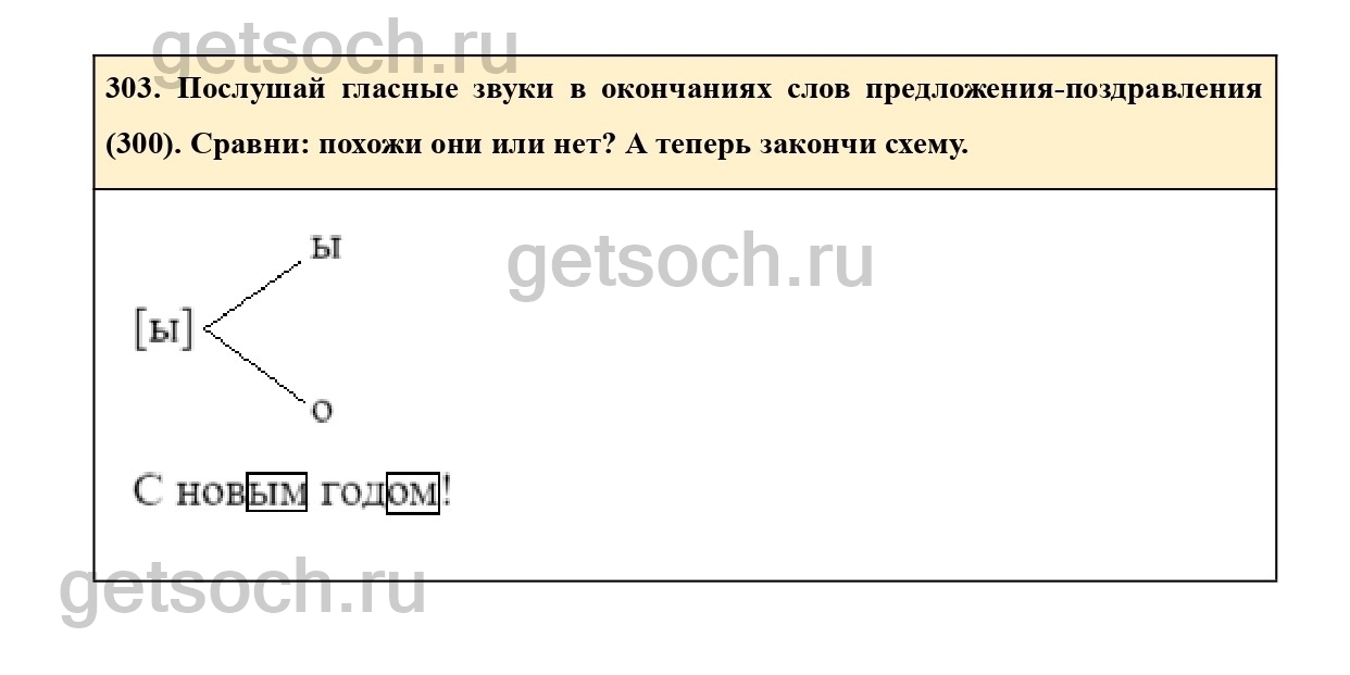 303. Послушай гласные звуки в окончаниях слов предложения-поздравления (300). Сравни: похожи они или нет? А теперь закончи схему.