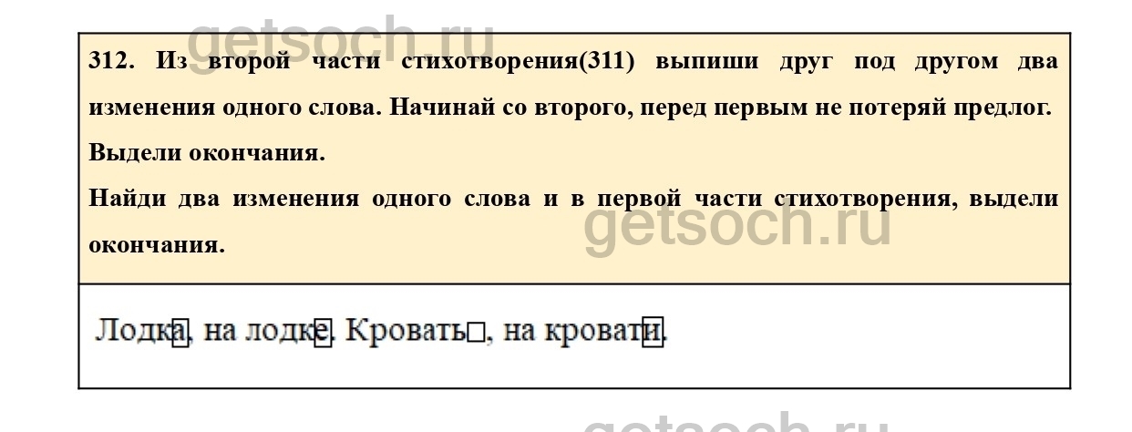312. Из второй части стихотворения(311) выпиши друг под другом два изменения одного слова. Начинай со второго, перед первым не потеряй предлог.