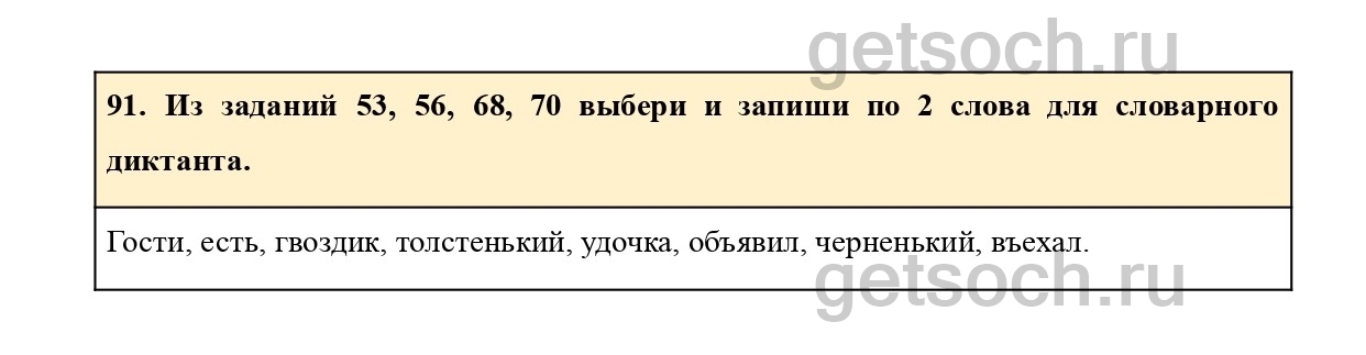 91. Из заданий 53, 56, 68, 70 выбери и запиши по 2 слова для словарного диктанта.