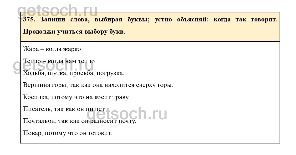 375. Запиши слова, выбирая буквы; устно объясняй: когда так говорят. Продолжи учиться выбору букв.