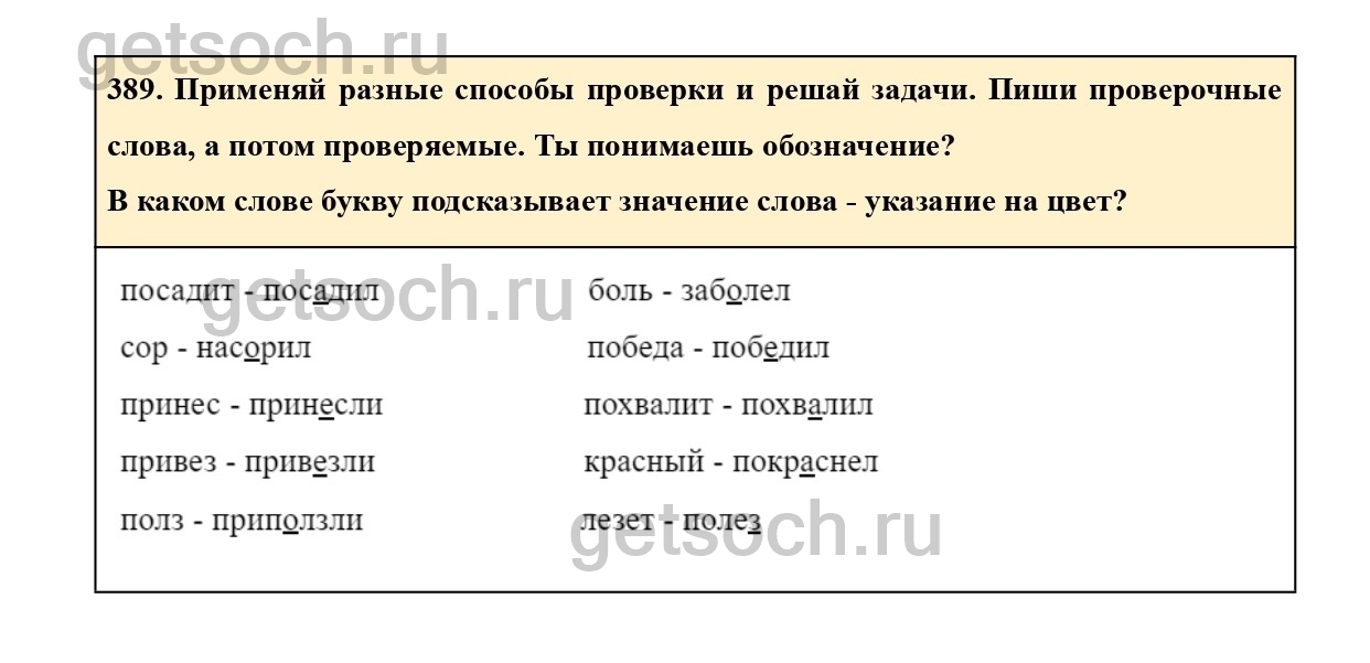 389. Применяй разные способы проверки и решай задачи. Пиши проверочные слова, а потом проверяемые. Ты понимаешь обозначение?