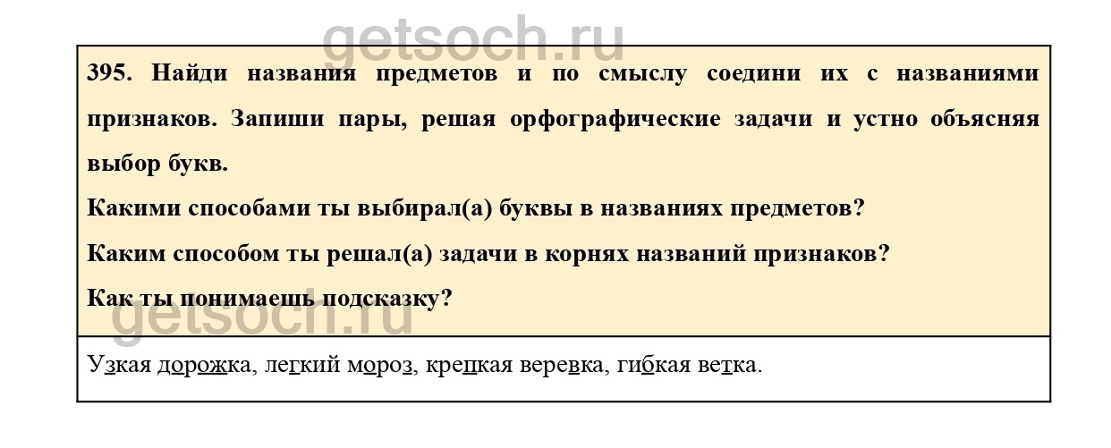 395. Найди названия предметов и по смыслу соедини их с названиями признаков. Запиши пары, решая орфографические задачи и устно объясняя выбор букв.
