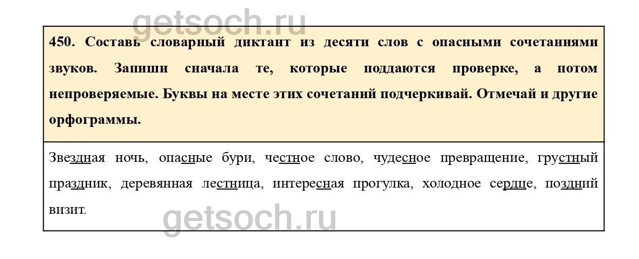 450. Составь словарный диктант из десяти слов с опасными сочетаниями звуков. Запиши сначала те, которые поддаются проверке, а потом непроверяемые. Буквы на месте этих сочетаний подчеркивай. Отмечай и другие орфограммы.