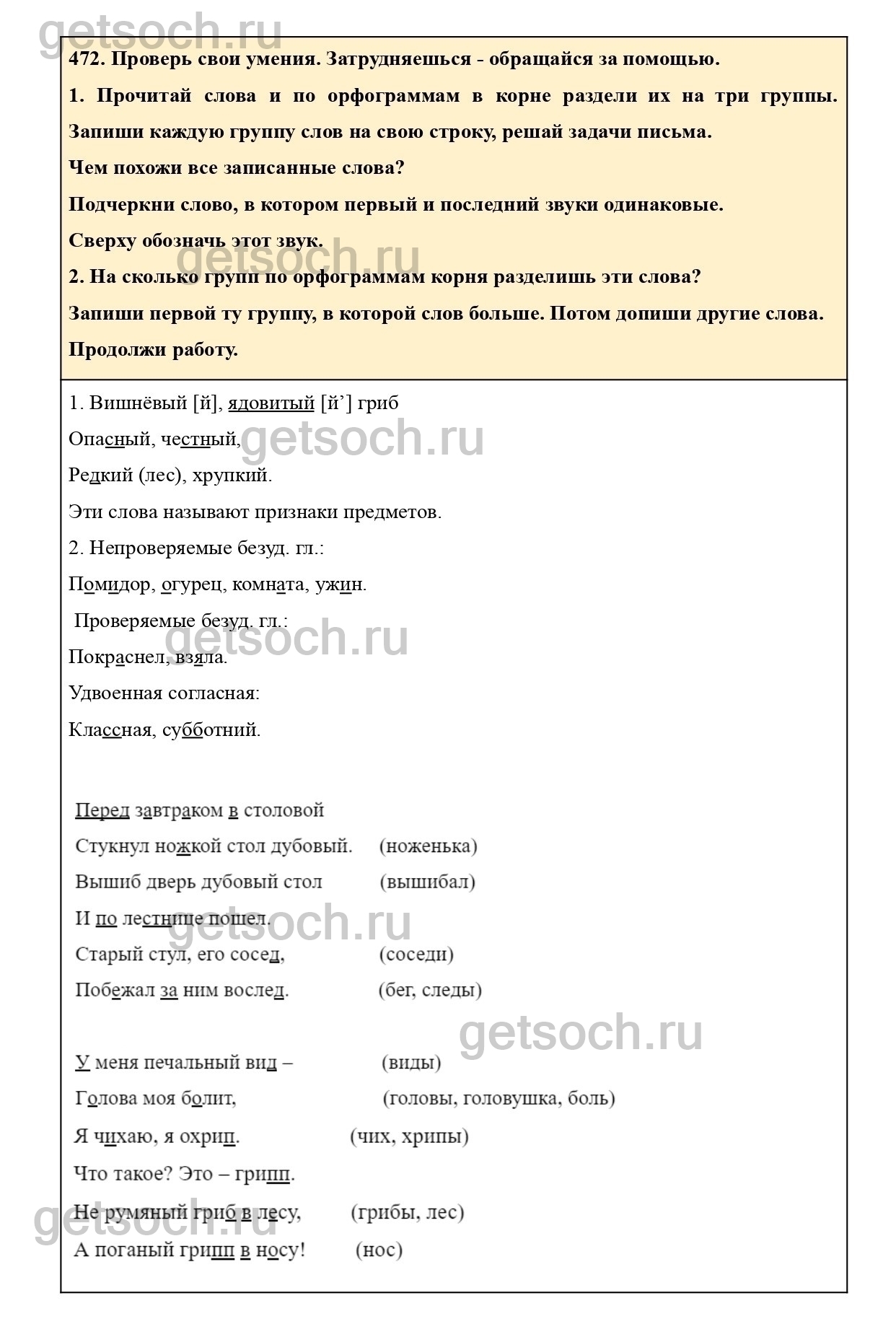 Рассмотрим ответы на Упражнение 472 из учебника по русскому языку для 2 класса Соловейчик