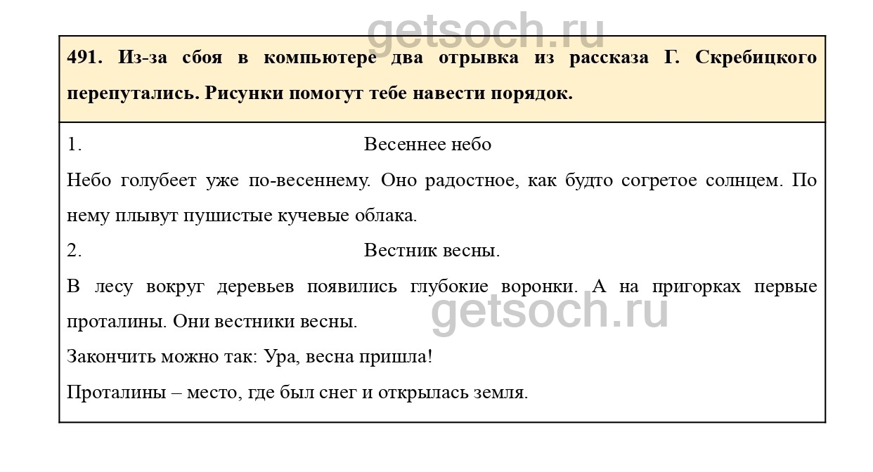491. Из-за сбоя в компьютере два отрывка из рассказа Г. Скребицкого перепутались. Рисунки помогут тебе навести порядок.