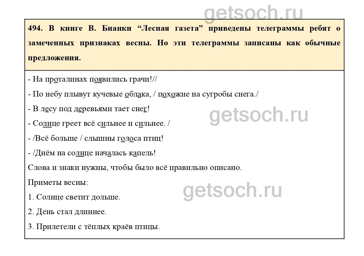 Рассмотрим ответы на Упражнение 494 из учебника по русскому языку для 2 класса Соловейчик