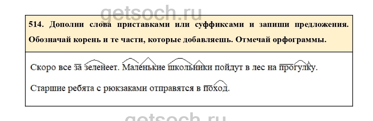 514. Дополни слова приставками или суффиксами и запиши предложения. Обозначай корень и те части, которые добавляешь. Отмечай орфограммы.