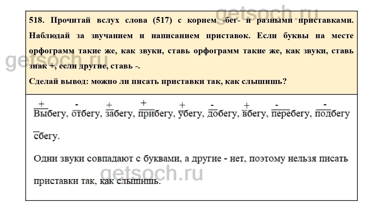 518. Прочитай вслух слова (517) с корнем -бег- и разными приставками. Наблюдай за звучанием и написанием приставок. Если буквы на месте орфограмм такие же, как звуки, ставь орфограмм такие же, как звуки, ставь знак +, если другие, ставь -.